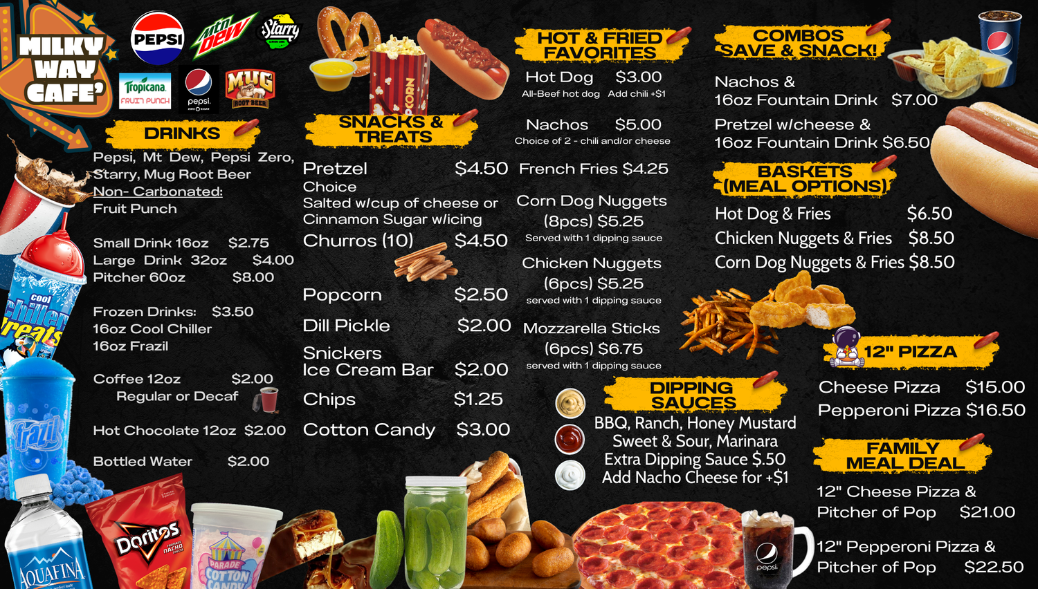 Whether you’re craving a quick snack, a refreshing drink, or a sweet treat, the Milky Way Cafe has something to satisfy every appetite. The menu includes classic favorites like hot dogs, pizzas, and a variety of sweet treats and beverages to keep you fueled for a day of skating fun. It’s the perfect spot to take a break, relax, and enjoy delicious food before heading back to the rink.