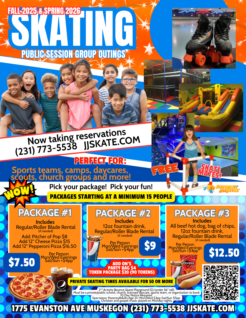 Includes 12oz Foutain Drink, Admission, Regular Skate or Roller Blade Rental (if needed)